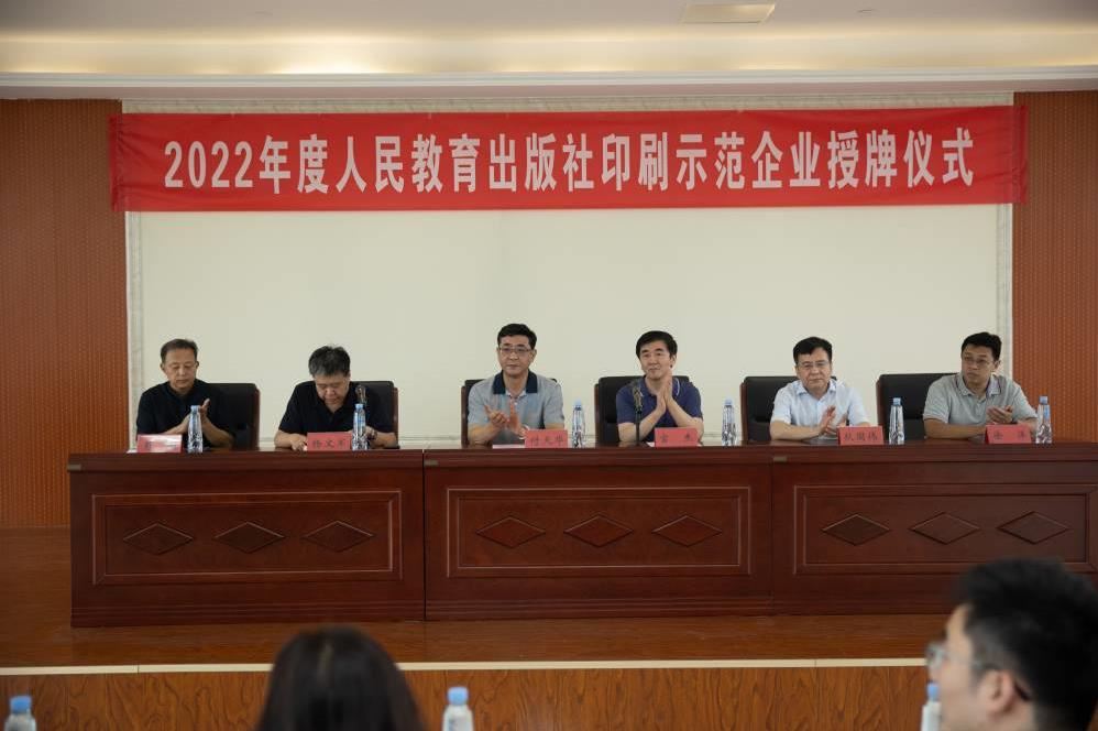 7月28日下午,人教社2022年度印刷示范企業授牌儀式在新華印務泰安分公司舉行,人7月28日下午,人教社2022年度印刷示范企業授牌儀式在新華印務泰安分公司舉行,人民教育出版社副社長付天華、出版部主任狄國偉,股份公司常務副總經理宮杰、副總經理楊文軍、教育產業部副主任徐洋,新華印務公司董事長肖剛、總經理貴雪媛等參加儀式,股份公司副總經理楊文軍主持儀式。