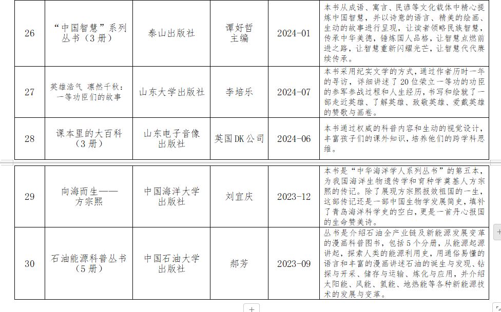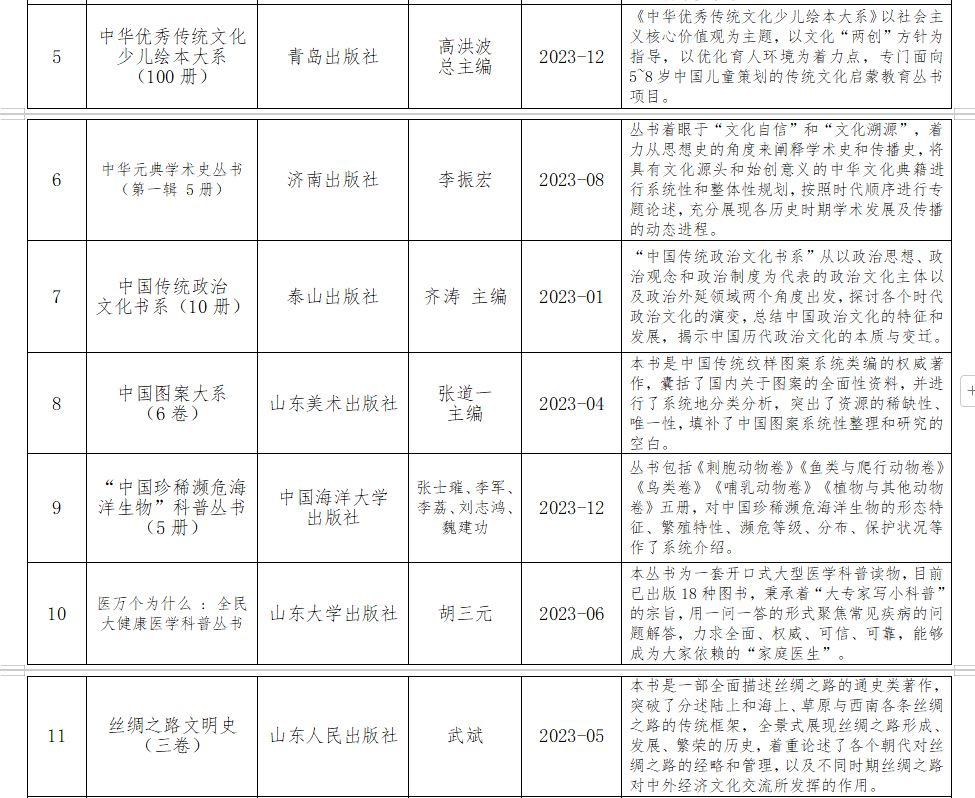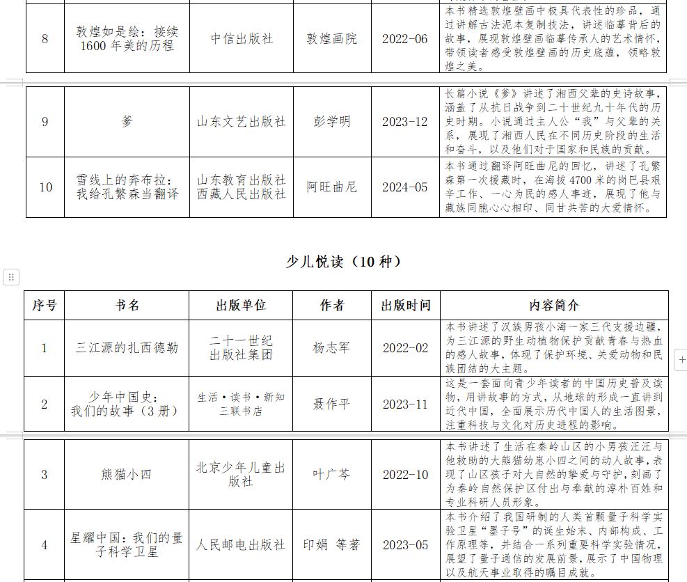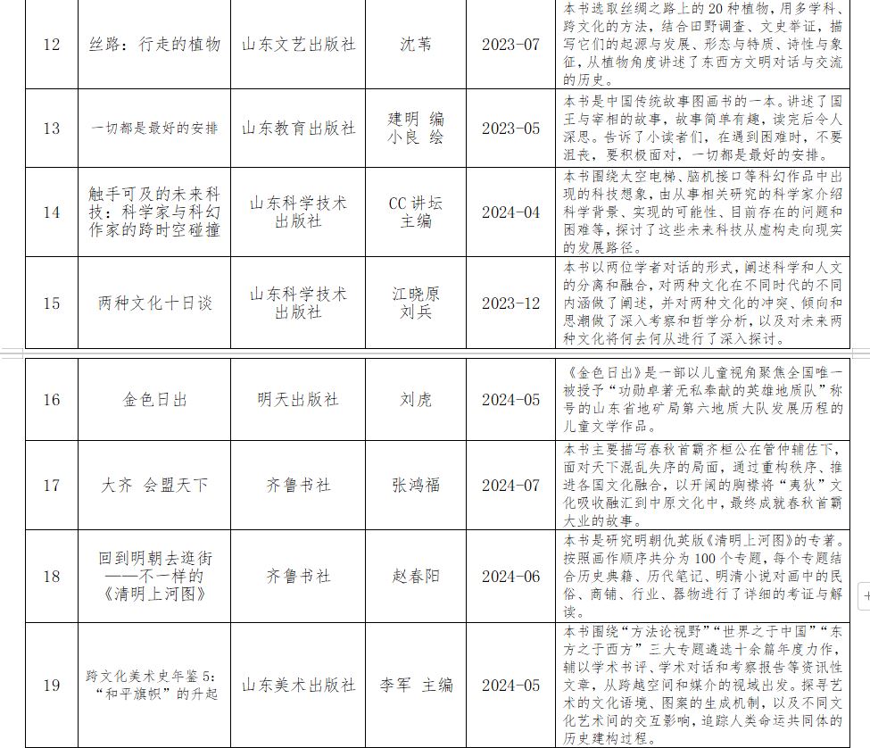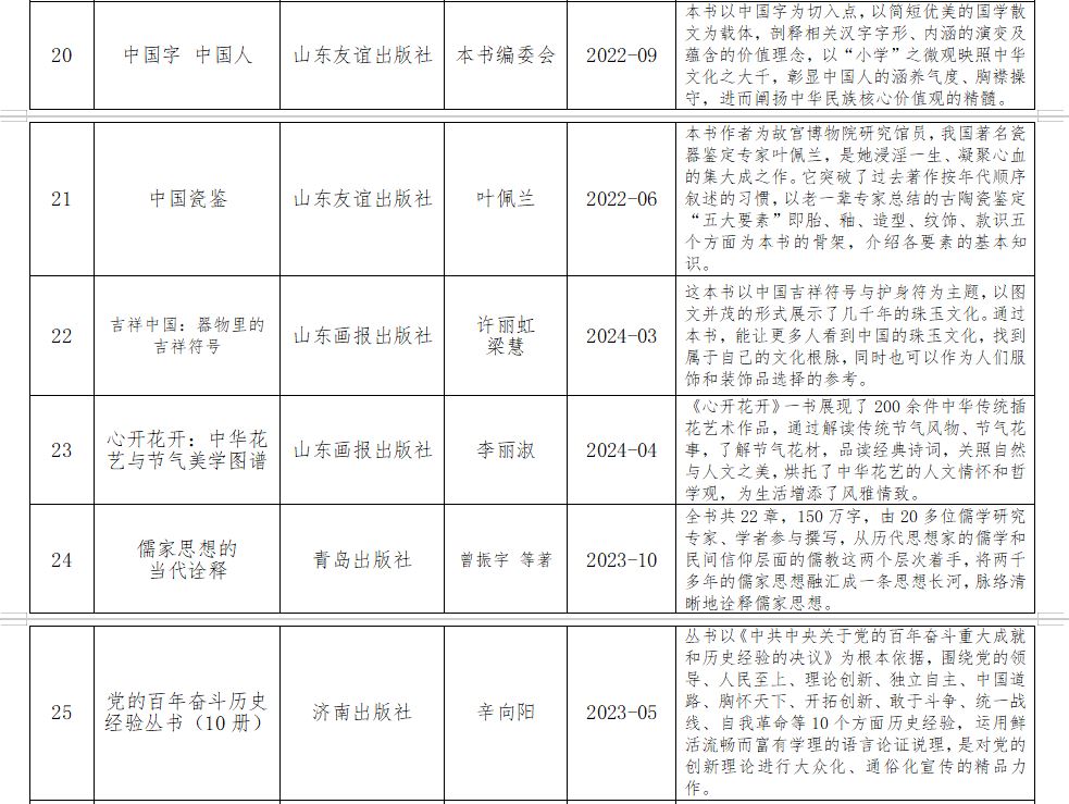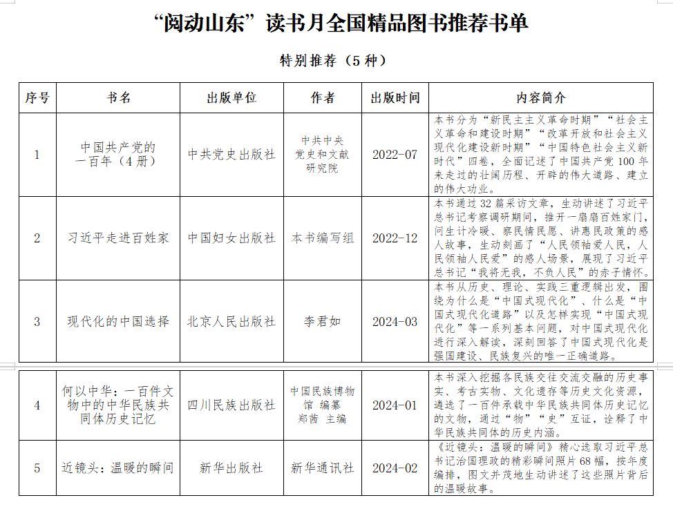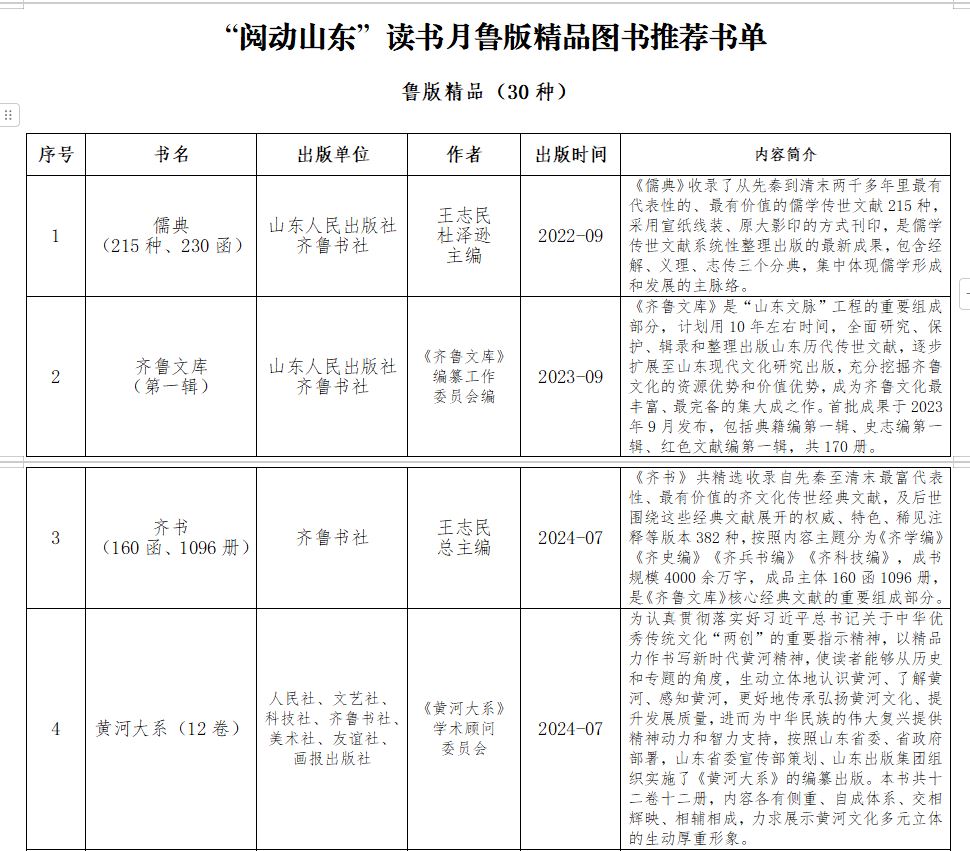“閱動山東”讀書月推薦書單分為“‘閱動山東’全國精品圖書推薦書單”和“‘閱動山東’魯版精品圖書推薦書單”。其中,“全國精品圖書推薦書單”推選35種優秀圖書,包括特別推薦(主題出版)5種、大眾品鑒10種、夕陽書香5種、少兒悅讀10種、巾幗雅韻5種;“魯版精品圖書推薦榜單”推薦魯版精品圖書30種。