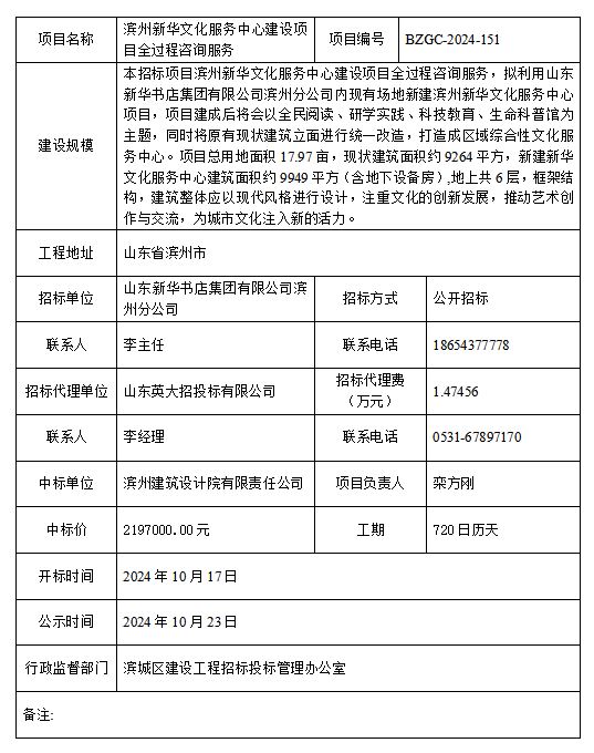 濱州新華文化服務中心建設項目全過程咨詢服務中標公示
