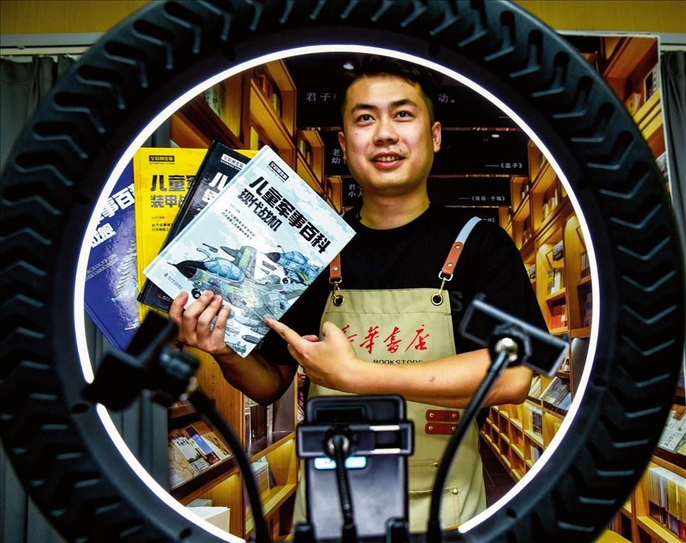 濟(jì)寧漫舟書城,主播正在用直播方式售書。網(wǎng)絡(luò)直播拉近了書店與讀者的距離,也為彼此之間的交流提供了更為便捷的渠道(曹俊波/攝影)