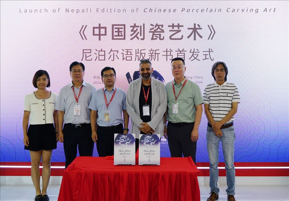 隨后,雙方共同為《中國刻瓷藝術》尼泊爾語版新書揭幕,并與參加活動領導一同合影留念。